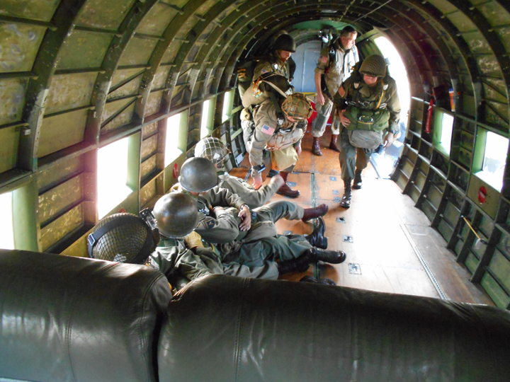 PARATROOPERS in the belly of the “Placid Lassie” await the drop zone in Holland last summer during a re-enactment of events in September 1944 in World War II. During the war, C-47s transported drums of gasoline, food, ammunition, and had room for Jeeps. It could hold up to 6,000 lbs.