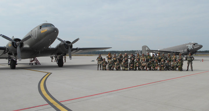 PARATROOPERS pose on an airfield next to the Placid Lassie last September , just before the C-47 went up and re-enacted a drop at the same location over Holland in World War II. Another C-47, the “Drag’Em Oot,” is at right.