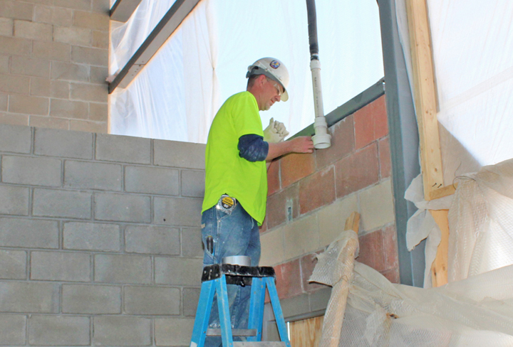 SETTING BUSHINGS on conduit sections atop a wall at the Clare Service Center is Troy Campbell of IBEW Local 692. He’s employed by Nelson Electric.