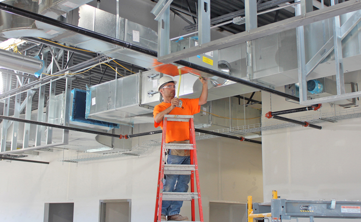 TAKING THE MEASURE of ductwork in a ceiling of the Consumers Energy Clare Service Center is Tony Montpas of Sheet Metal Workers Local 7. He’s employed by Dee Cramer.