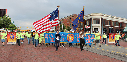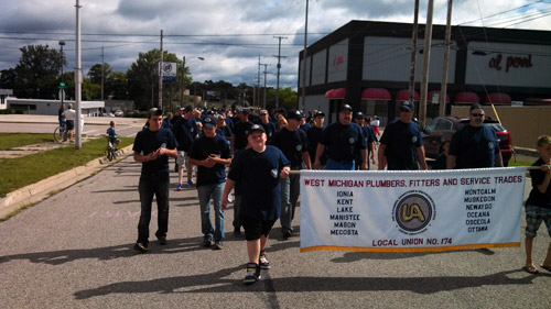 WEST MICHIGAN Plumbers Pipe Fitters and Service Trades Local 174 members walk behind their banner in Muskegon.