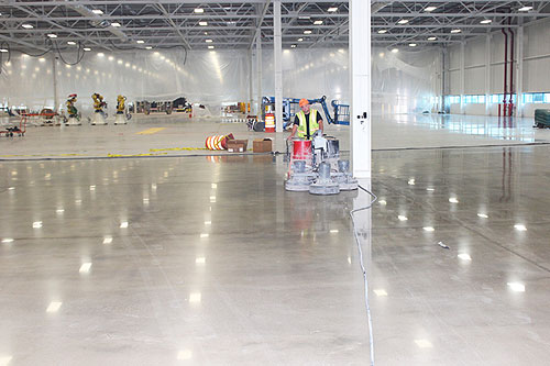 SMOOTH, SHINY, LEVEL – this section of concrete flooring in the Chrysler Sterling Heights Assembly Plant body shop has it all. One of the crew who built it is Brian Hennigar of Cement Masons Local 514, who is operating a floor grinder/polisher. He’s employed by Titan Industrial Flooring.