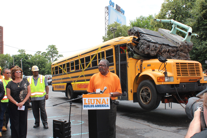LABORERS LOCAL 1191Business Manager Mike Aaron takes the mic at a June 24 press conference pushing for more state and federal road funding. Behind him: a a fake crushed school bus.