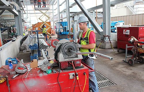 WORKING ON A SECTION of conduit at the Spray Dry Absorber project at the Karn Weadock plant is Derek Sims of IBEW Local 692. He’s employed by Conti Electric.