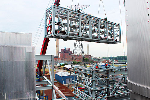 IRON WORKERS and Operating Engineers working for Ideal Steel set a utility trestle section to support the Karn Unit 2 Spray Dry Absorber at Consumers Energy’s Karn Weadock Generating Complex near Bay City.