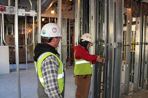INSTALLING CEILING lights in a patient room on the fifth floor of Beaumont Hospital-Troy’s West Patient Tower’s fifth floor are (l-r) Steve Garrett and Joe Solomon of IBEW Local 58, working for Ferndale Electric.