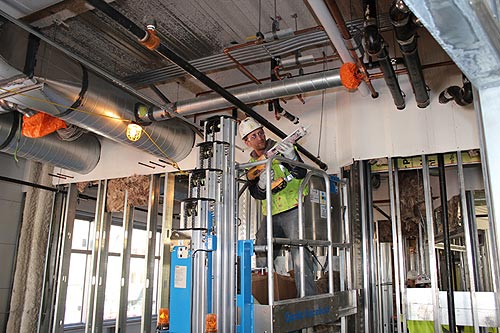 The thick concrete floor effectively separates the construction work on the West Bed Tower’s fifth floor with the patient care going on below on the fourth floor. That is, unless there’s drilling for pipe installation. During those scheduled hours of the day, patients and staff on the fourth floor are simply reassigned to other areas to avoid the noise. “I’d say that’s our biggest challenge here on a day-to-day basis, to lessen the interface of construction with occupied areas. But that’s a challenge with any hospital remodel,” Schroeder said.