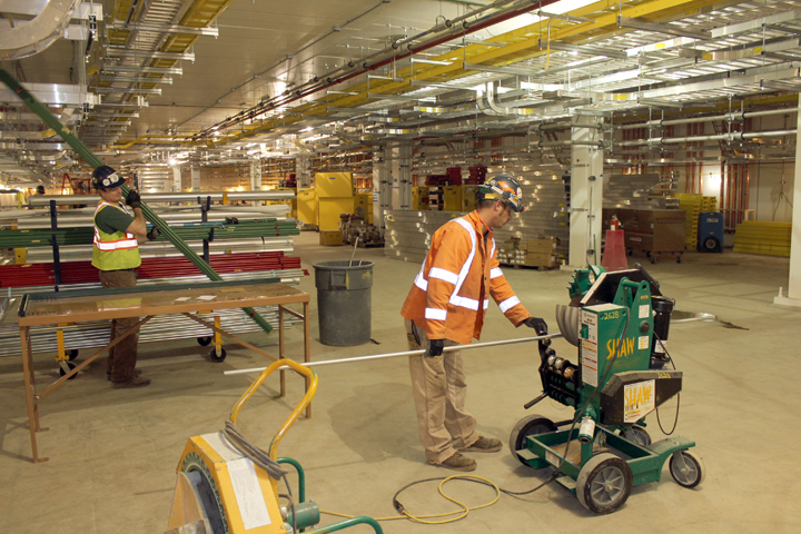 SQUARING UP HIS WORK on a six-inch stainless pipe at the FRIB is Steve Atherton of Plumbers and Pipe Fitters Local 333. He’s working for Gunthorpe Plumbing.