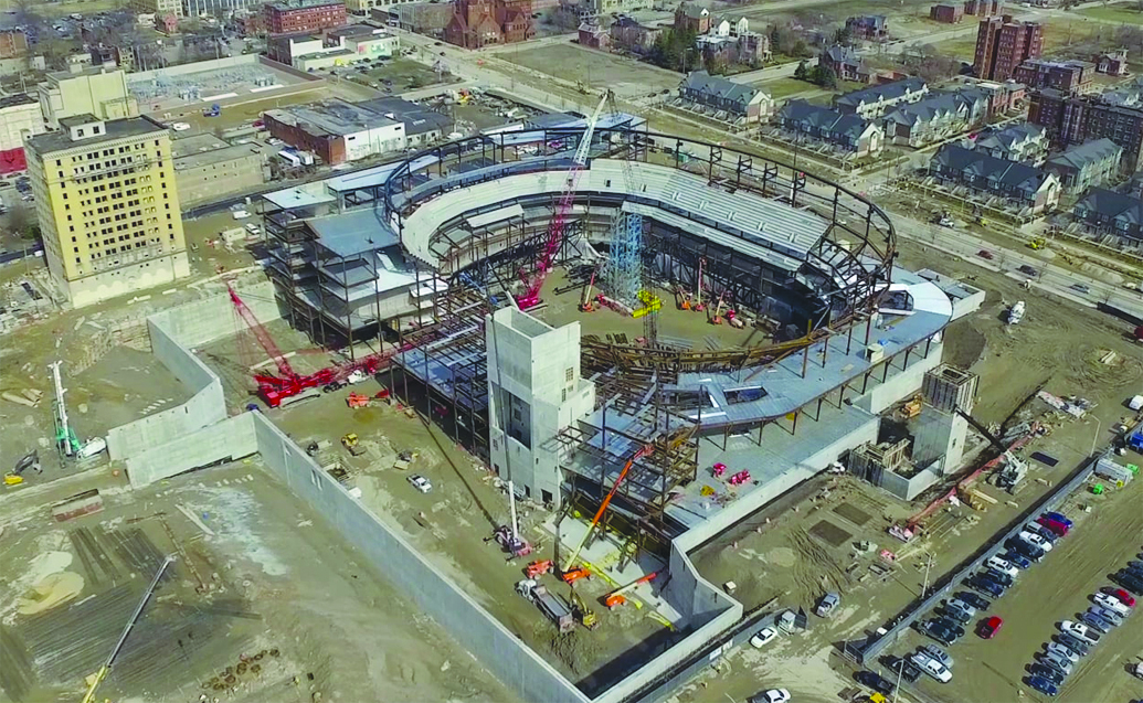 After having made a deep, wide hole in the ground last summer and fall at the stadium site north of I-75 and west of Woodward, the building trades have made tremendous progress working through the mild winter, building an iron structure that looks like it's almost ready to host a hockey game.