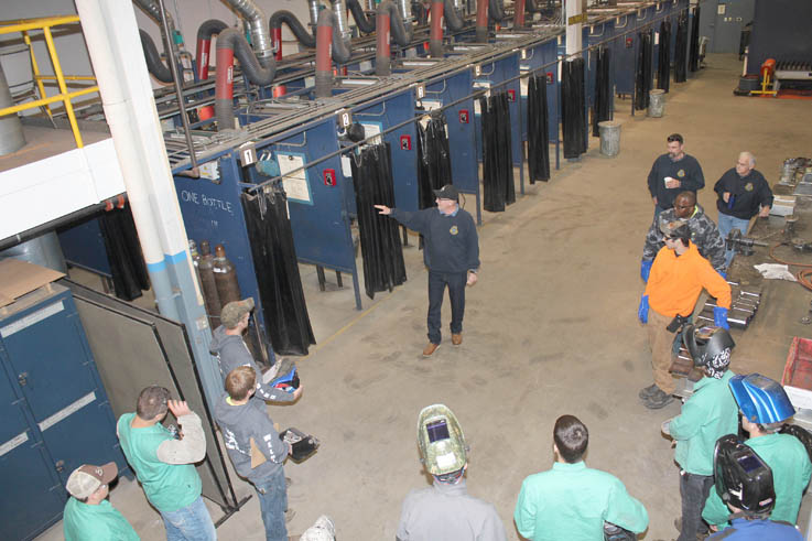 BOILERMAKERS LOCAL 169 instructor Lew Harris introduces the high school competitors to the welding booths at the union’s training center.