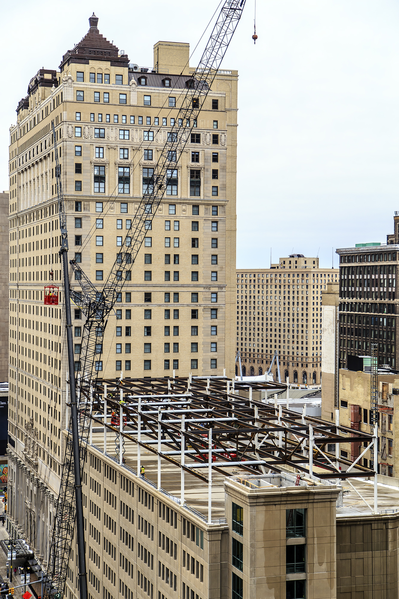 New residential space has been sorely lacking downtown, but construction of The Griswold is changing that conversation a bit. Construction manager Walbridge, its subcontractors and the building trades have begun erecting a five-story, 80-unit apartment building above an existing 10-story, 545-space parking deck. The lofty project was planned to follow the renovation of the landmark Westin Book-Cadillac Hotel next door in 2007, but the Great Recession put everything on hold, until now.