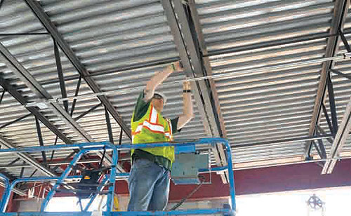SETTING UP A BOX in a ceiling of the new Jamrich Hall is Brad Olsen of IBEW Local 1070. He’s employed by S & T Electric.