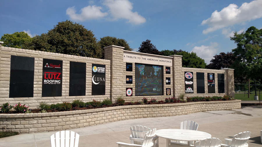 THE FINISHED American Workers Monument Wall, complete with a central video screen and inscriptions of local unions and supportive organizations and companies. Photo: Davida Gerrity/R