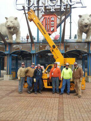 PART OF THE TRADES CREW at the Comerica Park Pepsi Porch revamp project includes (l-r) Iron Workers Local 25 members Eric Faust, Ray Brandly, Jeff Hamric, Bill Kostich, Jim Burton (Operating Engineers 324) and foreman Romeo Rowe. They’re employed by Ideal Contracting.