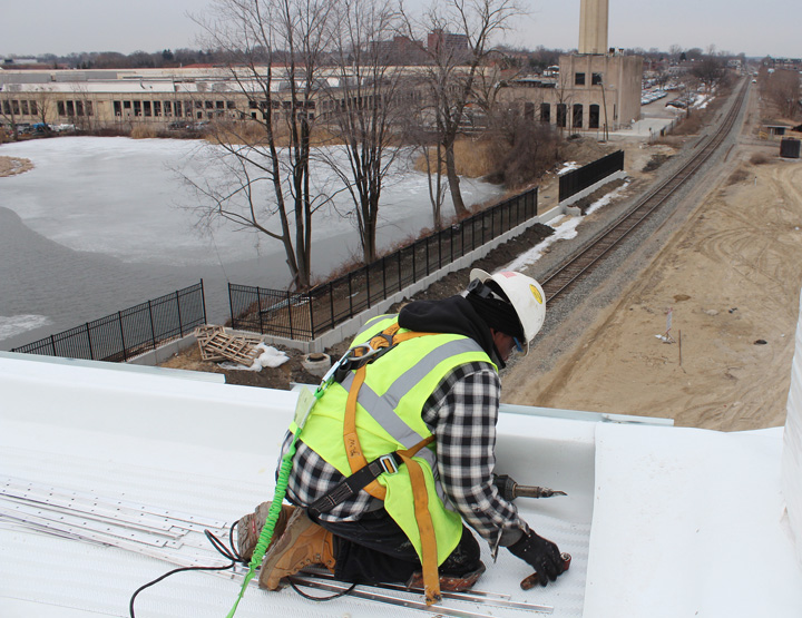 APPLYING A HEAT WELDED white single-ply roof over the Dearborn train station’s bridge is Randy Willis of Roofers Local 149, working for CEI.