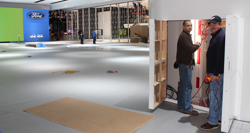 THE FORD MOTOR CO. display at the North American International Auto Show was empty, awaiting autos on Jan. 7 – but there were plenty of tradesworkers present setting up the show. Working on an electrical panel that will feed the display are (l-r) Derek Foreman and Bernie Matuszak of IBEW Local 58. They’re working for Motor City Electric. The public show is open at Cobo Center Jan. 18-26.