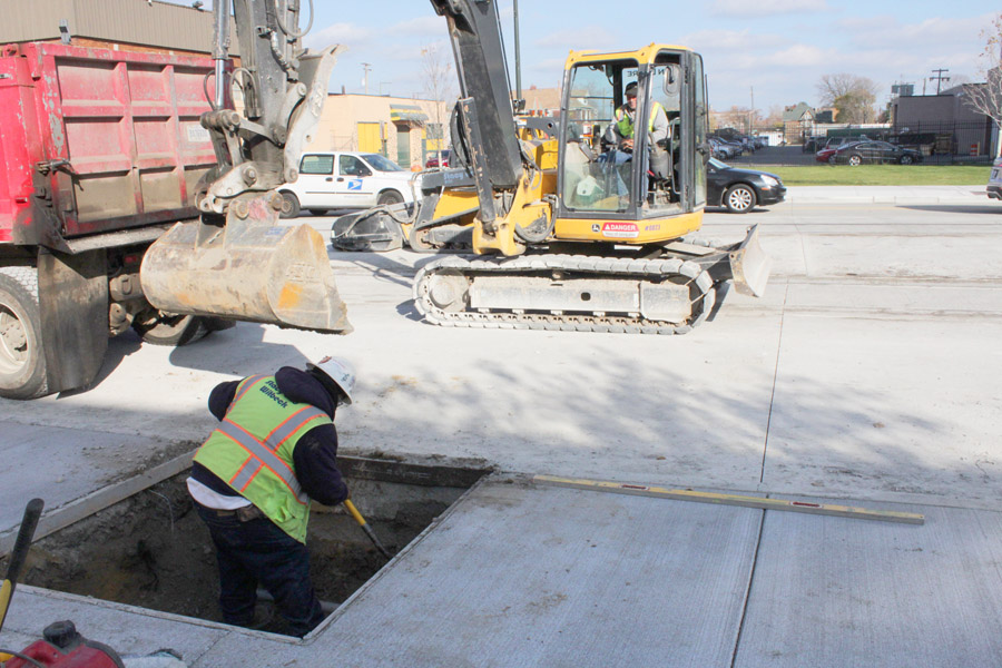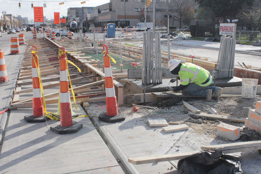 ADDING A FINE TOUCH to an electrical pad in the middle of Woodward Avenue near West Grand Boulevard in Detroit is Jose Andrade of Cement Masons Local 514. He’s employed by Merlo Construction. The Q-Line rails, at left, are shown running south.