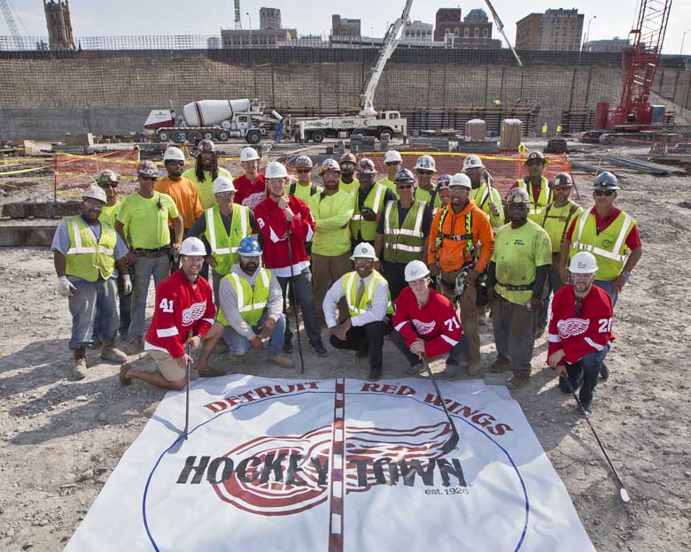 FIVE DETROIT RED WING players from Michigan were given a hard hat tour of the team's new hockey arena last month. Intermingled with construction workers at the site, wearing red jerseys and holding the tools of their trade are Red Wing players (l-r) Luke Glendening (from Grand Rapids), Dylan Larkin (Waterford), Justin Abdelkader (Muskegon), Danny DeKeyser (Warren) and Drew Miller (East Lansing). The banner on the ground, give or take a few feet, covers the actual center ice spot in the new arena. Construction on the $450 million, 18,000-seat stadium is progressing nicely with union trades and their contractors working under Barton Malow-White-Hunt. "Knowing what it's gonna be and seeing the plans and seeing what it looks like here, I think the location is great, gets the blood flowing gets you excited for an opportunity to play in the new building," Abdelkader told WXYZ-TV. Photo by Dave Reginek/via Olympia Entertainment
