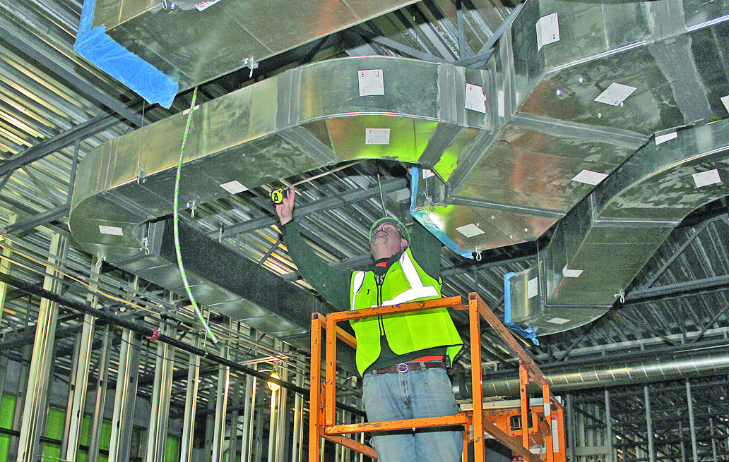 TAKING THE MEASURE of ductwork at the Sparrow Health Center Lansing project is Mike Zimmerman of Sheet Metal Workers Local 7. He’s working for Applegate.
