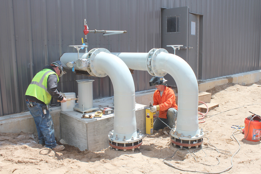 COOLING WATER PIPING at the Wolverine Power Alpine Plant gets the attention of Bob Schaub and Jason Weiksner of Plumbers and Steamfitters Local 85. They’re employed by Boldt.