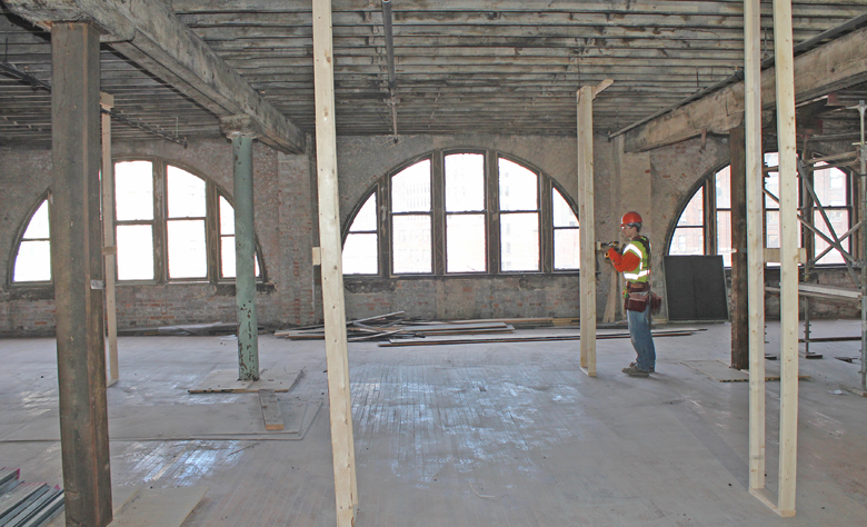 BUILDING A NEW interior wall frame on the fifth floor of 119 State Street in Detroit is Travis Longuski of Carpenters Local 687. He’s employed by Tooles Contracting. Stripped to its shell, this floor and most of the rest of the building currently appear as it did in 1887.