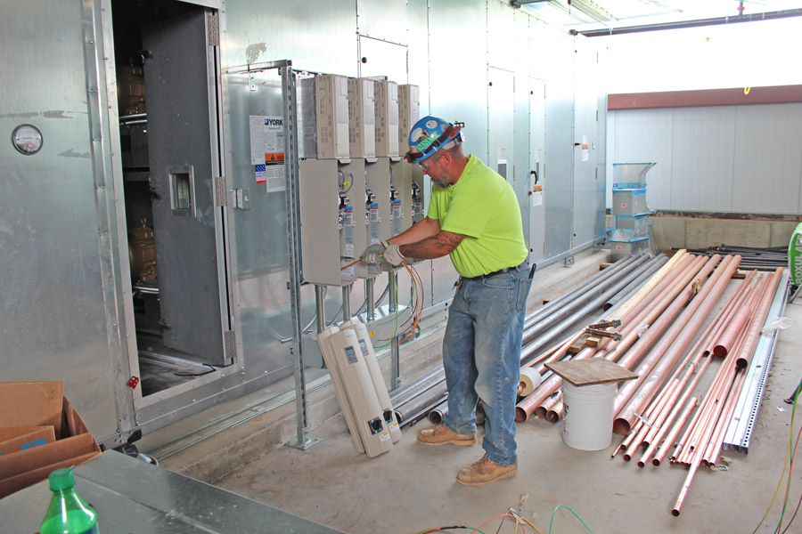 PULLING #10 THHN WIRE through a panel at the Sparrow Plaza project is Justin Larrison of IBEW Local 665. He’s employed by Superior Electric.