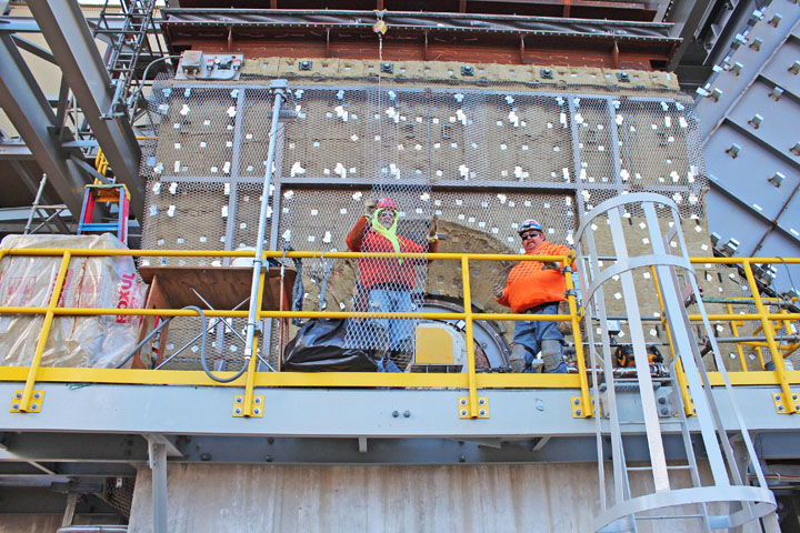 SETTING UP MESH in the process of insulating an ID fan at the J.H. Campbell Plant are Eric Steinke and Chris Jarman of Heat and Frost Insulators Local 47. They’re employed by Great Lakes Mechanical.