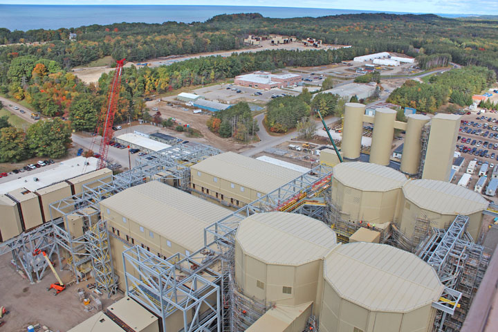 HERE’S A BIRD’S EYE view of new emission control work at the Consumers Energy Campbell Plant Unit 3 in West Olive, near Lake Michigan. Most prominent in the foreground are two new baghouse structures, four new cylindrical spray dryer-absorbers, and three lime prep structures.