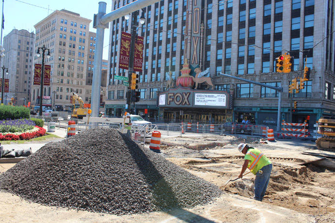 LABORER Greg Hoffman of Local 1076 does some hand-held excavating in front of the Fox Theatre in Detroit as part of the M-1 Rail Project. He’s employed by Rauhorn Electric.
