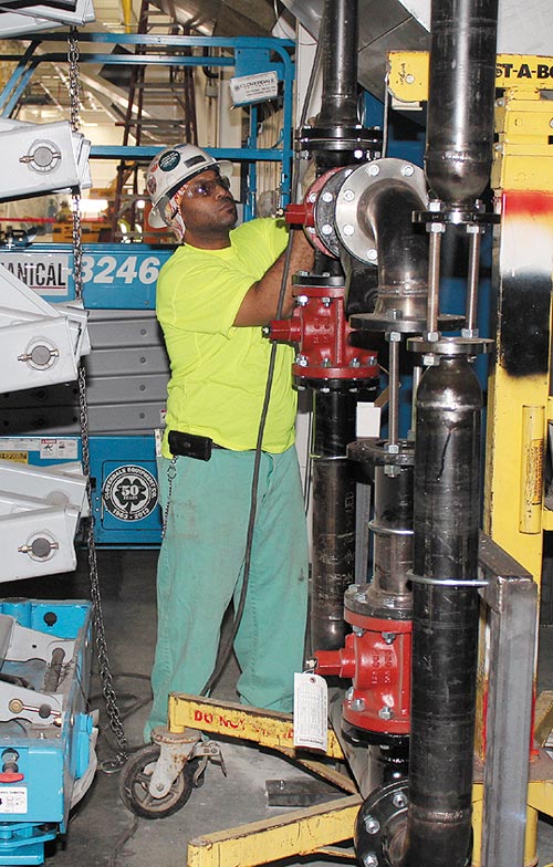 BUILDING A GAS metering station in the Chrysler Paint Shop’s E-coat area is Khris Bracey of Pipe Fitters Local 636, employed by E.L. Mechanical.