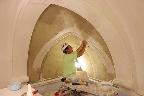 “We’re doing all these lunettes by hand,” said Russell plasterer Pat O’Shea. “It’s a challenge. You just need to look carefully at what you’re doing. But I will say, it’s nice to be able to do this kind of work for a change, and not have to work in a flat world. Working here, you get to appreciate the original craftsmanship – it was fantastic, what they were able to do with the tools they had.”