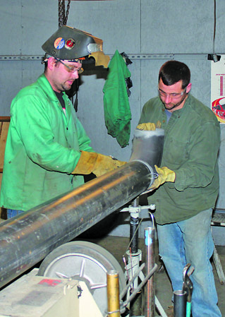 SETTING UP a six-inch carbon steel fitting for a weld are Brian Wynne and Brad Letts of Plumbers and Steamfitters Local 85.