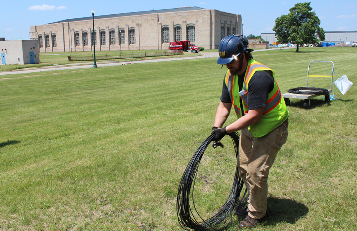 COILING WIRE used for exterior lighting at the Springwells plant is apprentice Ian McIlhargey of IBEW Local 58. He’s employed by Shaw Electric. Behind him is one of many architecturally classic buildings at the sprawling water plant, this one used as a boilerhouse and for maintenance.