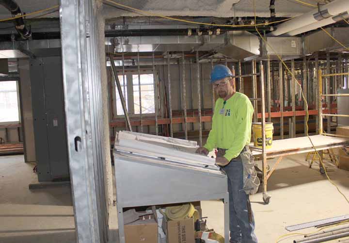 LOOKING OVER DUCTWORK blueprints at the Battle Creek VA Hospital Building No. 39 is Jeff Tysen of Sheet Metal Workers Local 7. He’s employed by Mall City Mechanical.