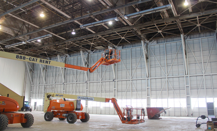 GOING UP in Bay 2 of Hangar No. 1 at Willow Run Airport is Foreman Steve Benyi of Plumbers Local 98, working for Progressive Mechanical. The plumbers have installed the blue-sided infrared heaters hanging from the rafters.