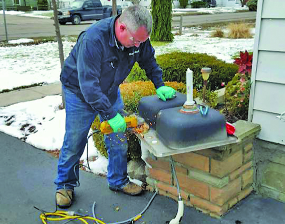MOST VISITS by plumbers to homes in Flint are in and out: install filters on the kitchen faucets, and they’re done. Here, Local 370 volunteer Paul Davis had to remove a homeowner’s entire sink to cut off an old faucet, in order to install a modern faucet that would accept a filter.